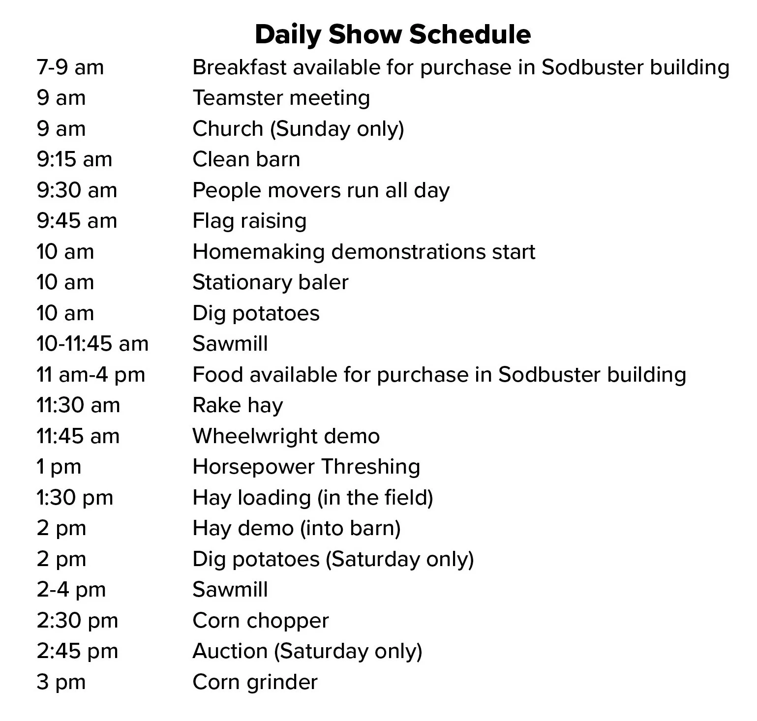 To preserve the heritage of the area by demonstrating the farming methods and lifestyles of the 1900's Fall Sodbuster DaysSept. 6-7, 2025